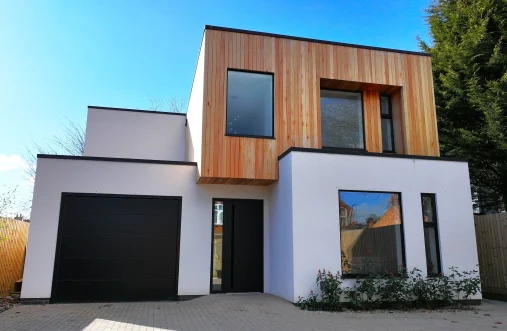 Our client sought a striking, modern family home, and we responded with a bold contemporary design. The house features a spacious open-plan living area, four double bedrooms. The generous master suite comes complete with a dressing room. Juliet balconies to the rear bedrooms provide views over newly landscaped gardens, while a double-height entrance hall with galleried landing creates a dramatic sense of arrival.