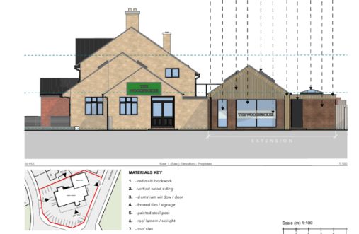 The new extension at The Woodpecker Public House presented a design challenge with a neighbouring residential property directly adjacnet the sote for the extension. The scheme required a sensitive approach to balance the impact potential noise disturbance on the neighbours. The solution involved carefully angling the windows to the extension to mitigate potential noise nuisance while preserving the privacy and comfort of nearby residents. This orientation not only minimised disruption but also created an inviting connection to the existing pub, enhancing the overall customer experience. Internally, the new extension features a brick clad entrance with glazed sliding doors, and the vaulted ceiling significantly enhances the sense of space and volume.